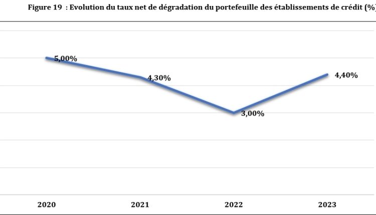 En ce qui concerne le taux brut de dégradation du portefeuille qui est le ratio entre les créances en souffrance brutes et les crédits bruts, il a connu un repli de 1,1% pour ressortir à 8,70% à fin décembre 2023, contre 9,80% en 2022. Cette situation favorable est principalement le résultat d’une plus grande maitrise des créances en souffrance brutes par les banques comparativement aux crédits à la clientèle.